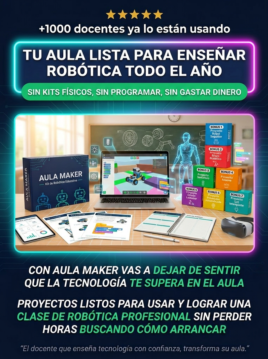 Un sistema completo para docentes que necesitan enseñar robótica con confianza, sin kits físicos, sin saber programar y sin gastar un peso extra — con 7 proyectos listos para usar en el aula desde hoy.